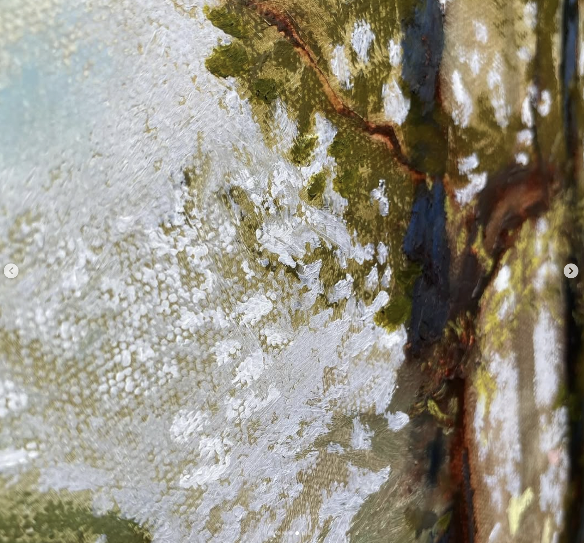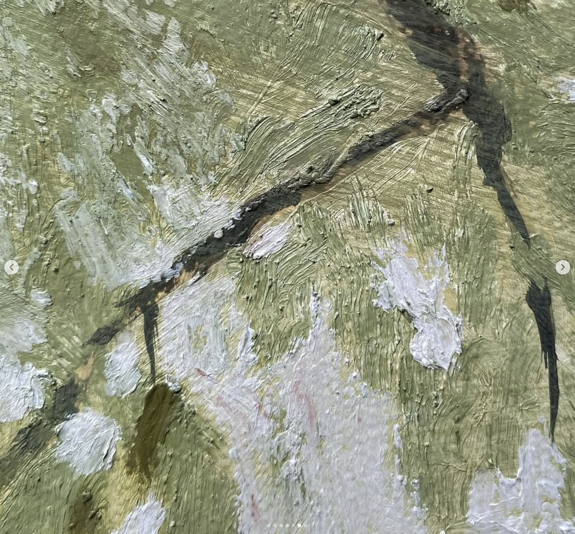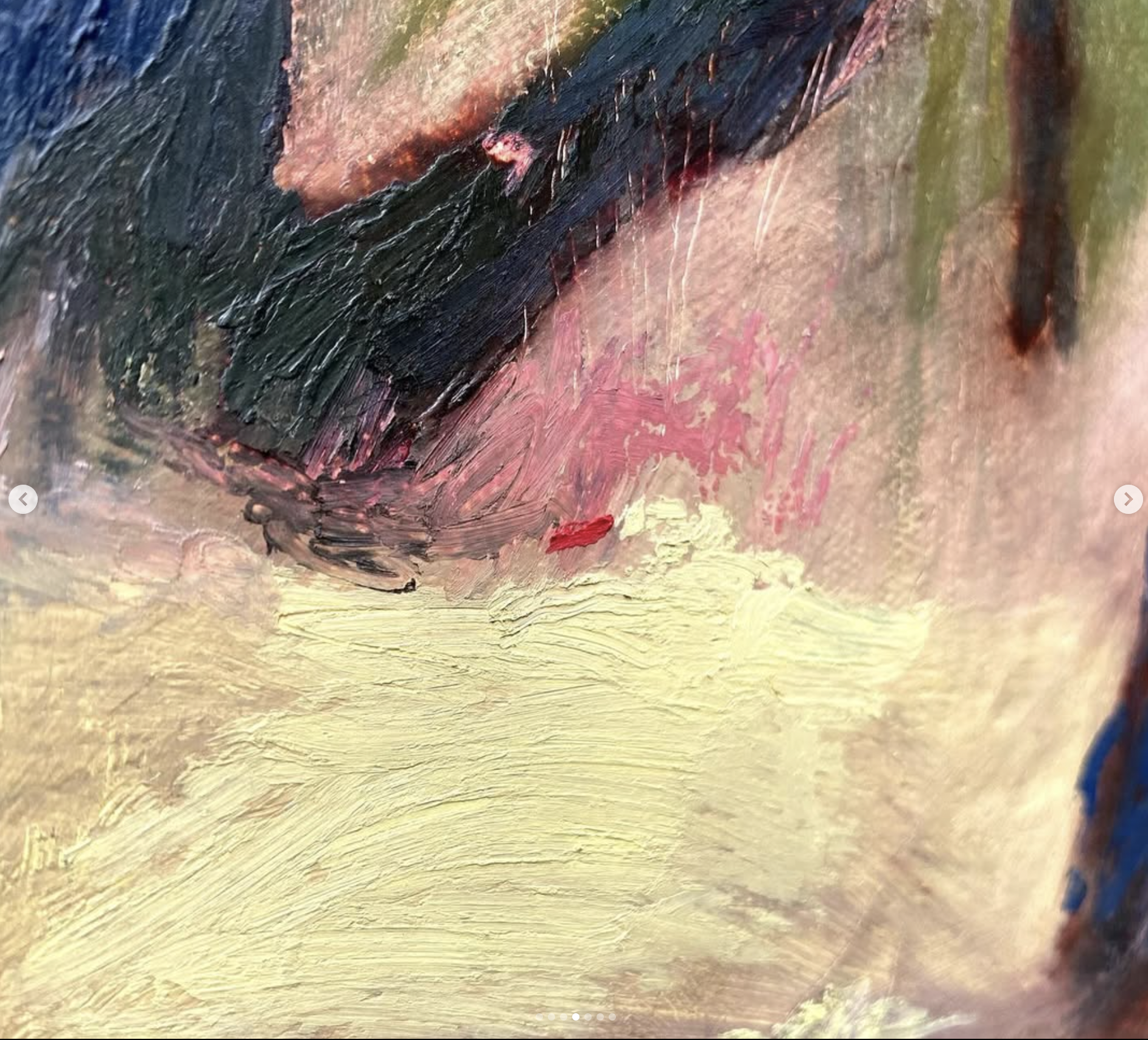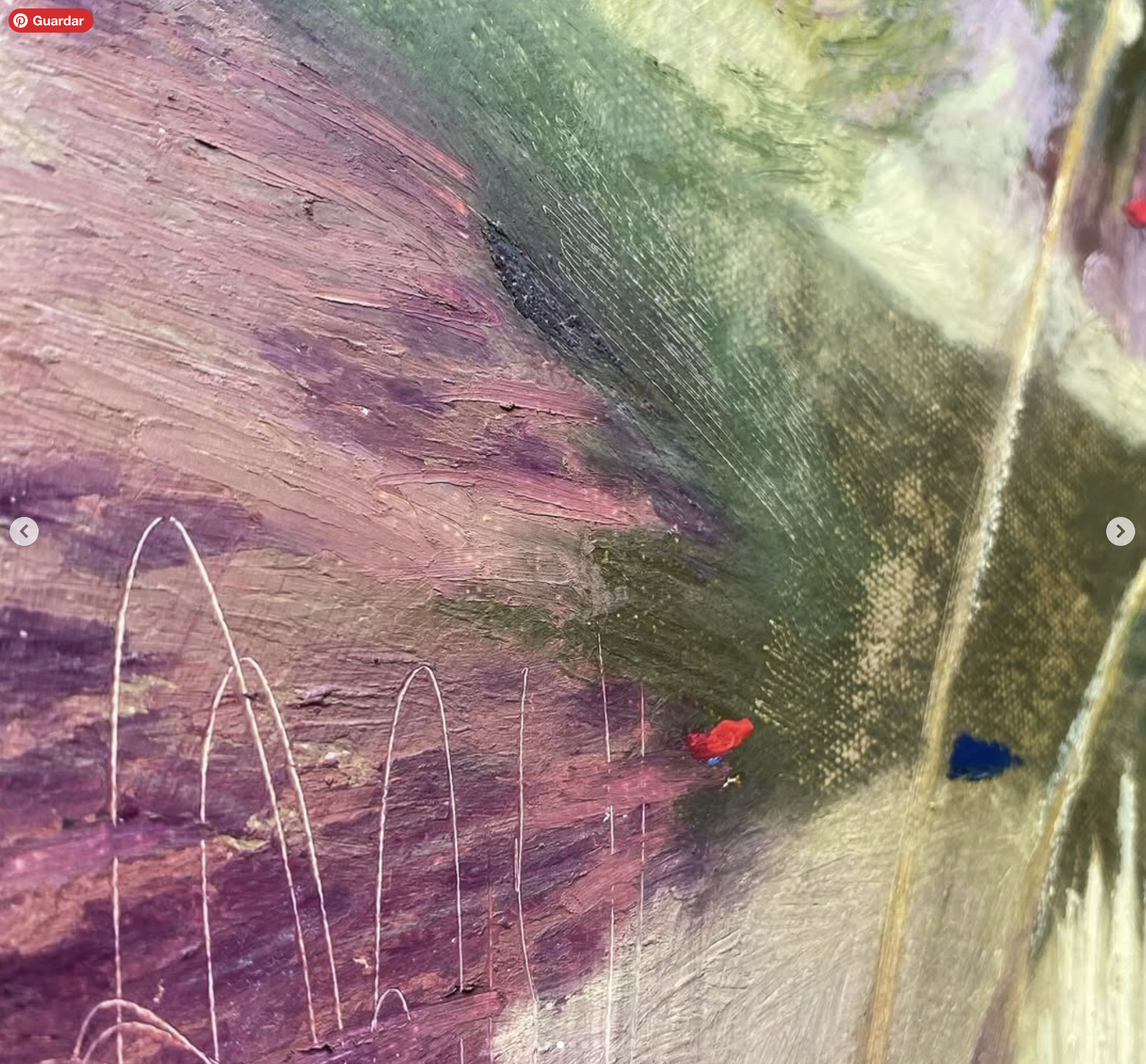 El paisaje no se centra tanto en ser fiel a la realidad como en transmitir mis sensaciones durante el trayecto, la conexión con el bosque, el movimiento incesante de la naturaleza, donde me incluyo, y su luz. Representa un momento de paz y de sosiego fuera y dentro de mi. Durante el proceso de trabajo me permito tiempo para fantasear, imaginar y experimentar. Esto resulta perceptible en la paleta de color escogida, alejada de la realidad de este espacio en una temporada otoñal. Los árboles pierden sus hojas y se despiden de una época de esplendor y lo hacen meciéndose como si bailaran unos con otros, agradeciendo la luz que se cuela entre un follaje efímero que pasa sus últimos momentos lejos del suelo.