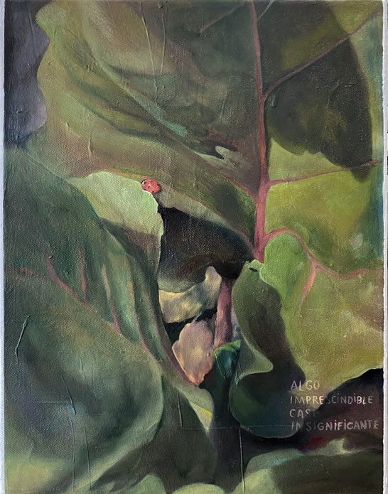 Algo imprescindible es una pequeña obra pintada con óleo sobre un lienzo recuperado. Anteriormente era un cuadro sobre el que hice un ejercicio en mis años de facultad. Esta reutilización del material está ligada al concepto de la obra, ya que la pintura sobre la que versa la frase "Algo imprescindible casi insignificante" simboliza para mi el retorno a la pintura. Tras una larga crisis de cuatro años en la que no pude conectar con el acto de crear, encontré la respuesta a mi problema en observar lo pequeño, los detalles. Este cuadro retrata a una mariquita que paseaba por una hoja de acelga en mi huerto. Se puede ver la influencia de O'Keeffe y sus alusiones recurrentes al sexo femenino. Vagina, útero y creación íntimamente ligados a la creación.